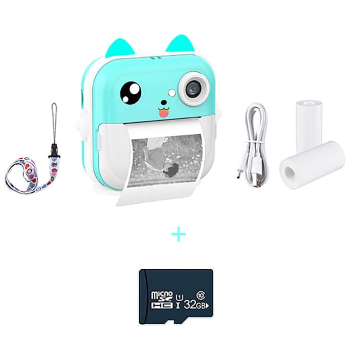 W Zestawie: 1x aparat, 1x kabel USB, 2x rolka do druku, 1x pasek na nadgarstek, 1x karta Micro SD 32 GB